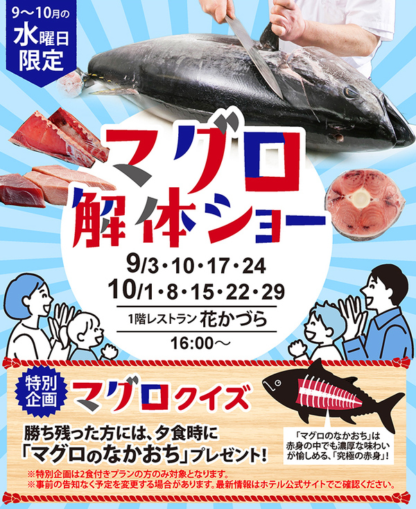 備考 | 9月・10月の毎週水曜日は レストラン花かづらにて大迫力の『マグロ解体ショー』を開催します! さらに特別企画「マグロクイズ」にも挑戦し、最後まで勝ち残ったお客様には夕食時に“マグロの中おち”をプレゼント! ぜひこの機会をお見逃しなく! https://www.maholova-minds.com/event/detail.php?CN=119936 |