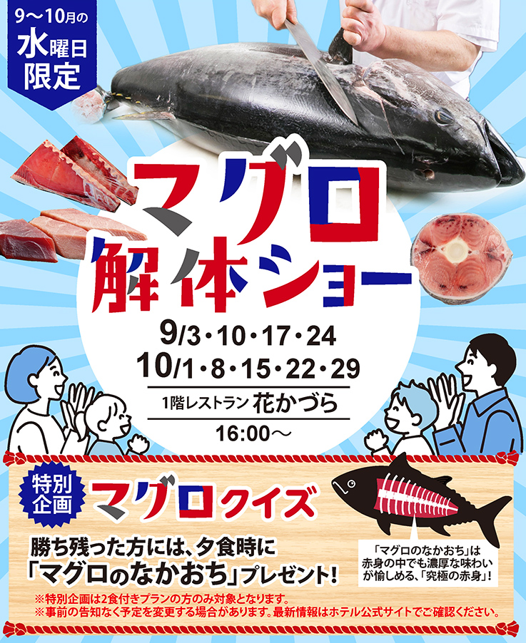 備考 | ※解体ショーは夕食バイキングの時間帯の実施ではありません。 ※クイズへの参加資格は2食付の宿泊プランでお泊まりのお客様のみです。 |